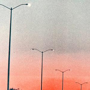 Sun sets as the streetlights come on. A simple 2 color Riso print in fluorescent orange and light teal.