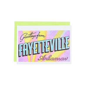 A new colorful and modern take on the 'Greetings From' series printed on Riso, featuring the city of Fayetteville, Arkansas!