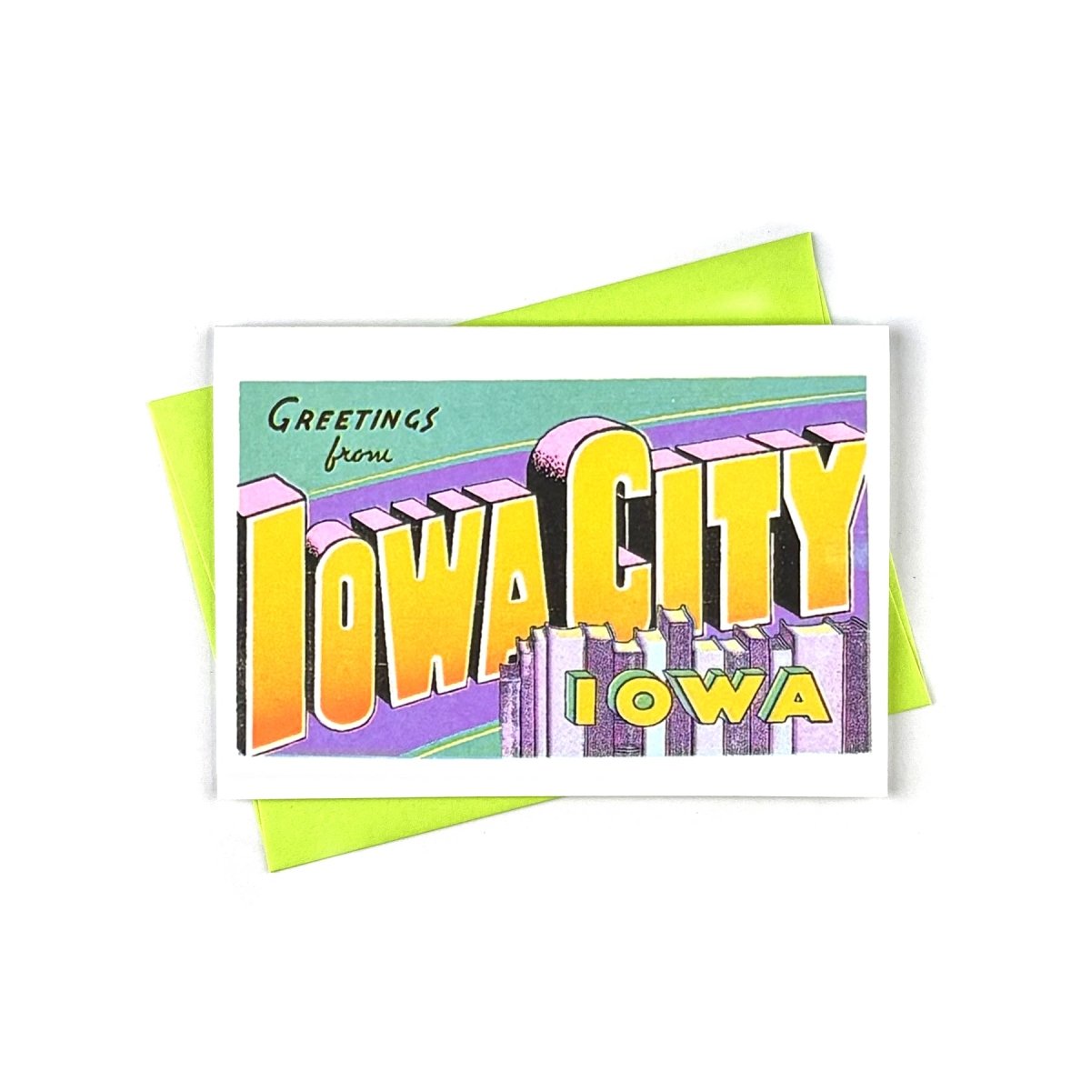 A new colorful and modern take on the 'Greetings From' series printed on Riso, featuring a bright and colorful Iowa City, IA!