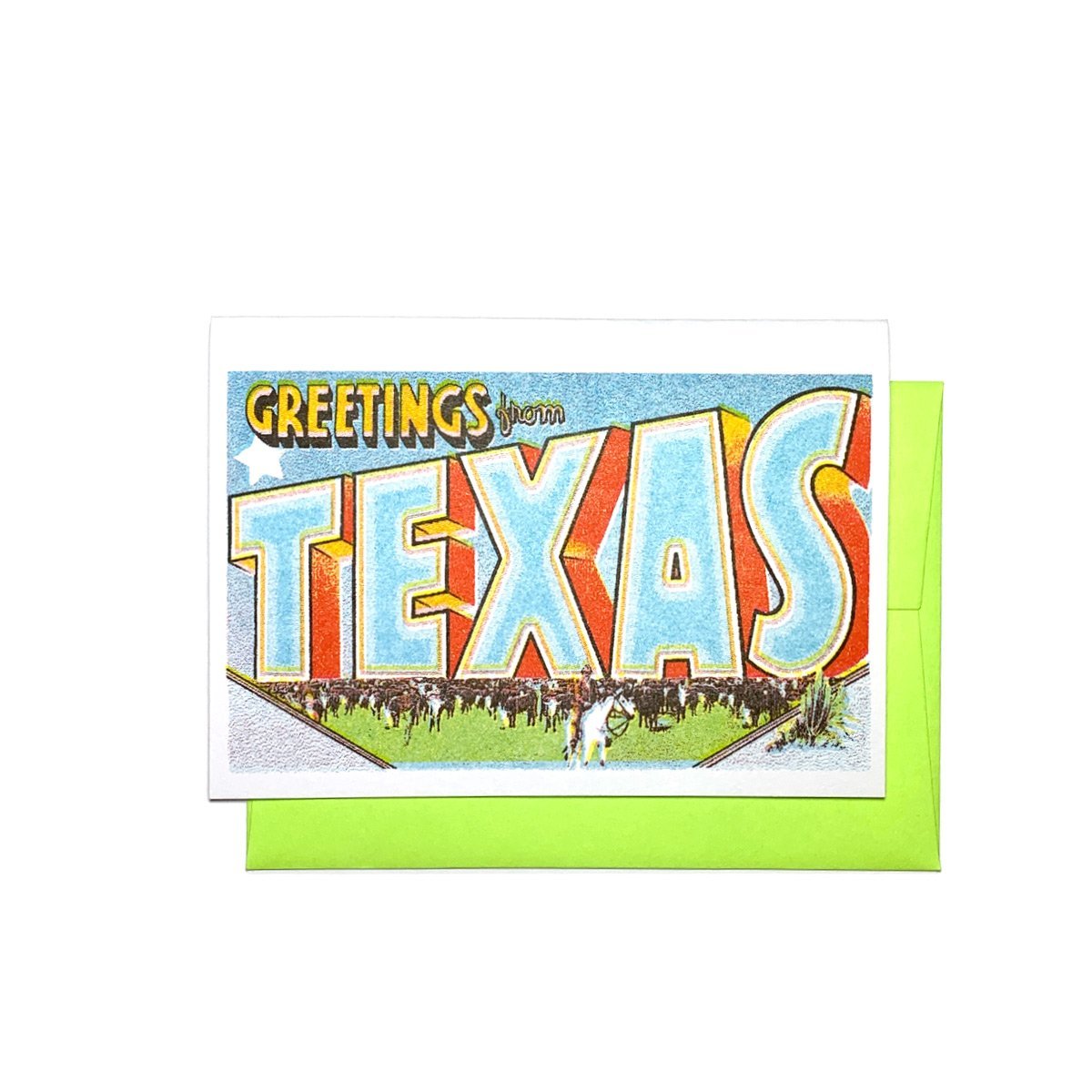 A new colorful and modern take on the 'Greetings From' series printed on Riso, featuring the great state of Texas!