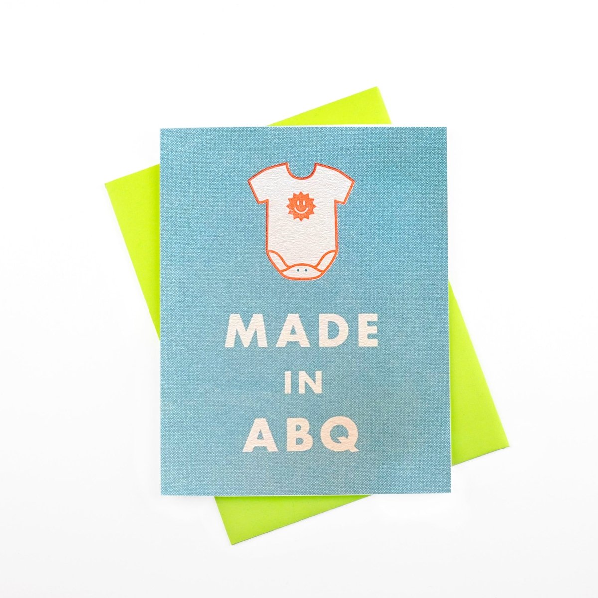 Made for all our local Albuquerque friends! Send a warm welcome to their little one with this funny baby card featuring a sunny baby onesie saying "Made in ABQ".