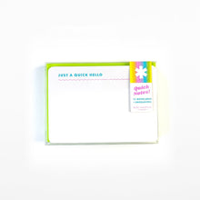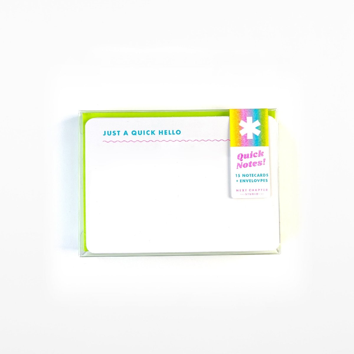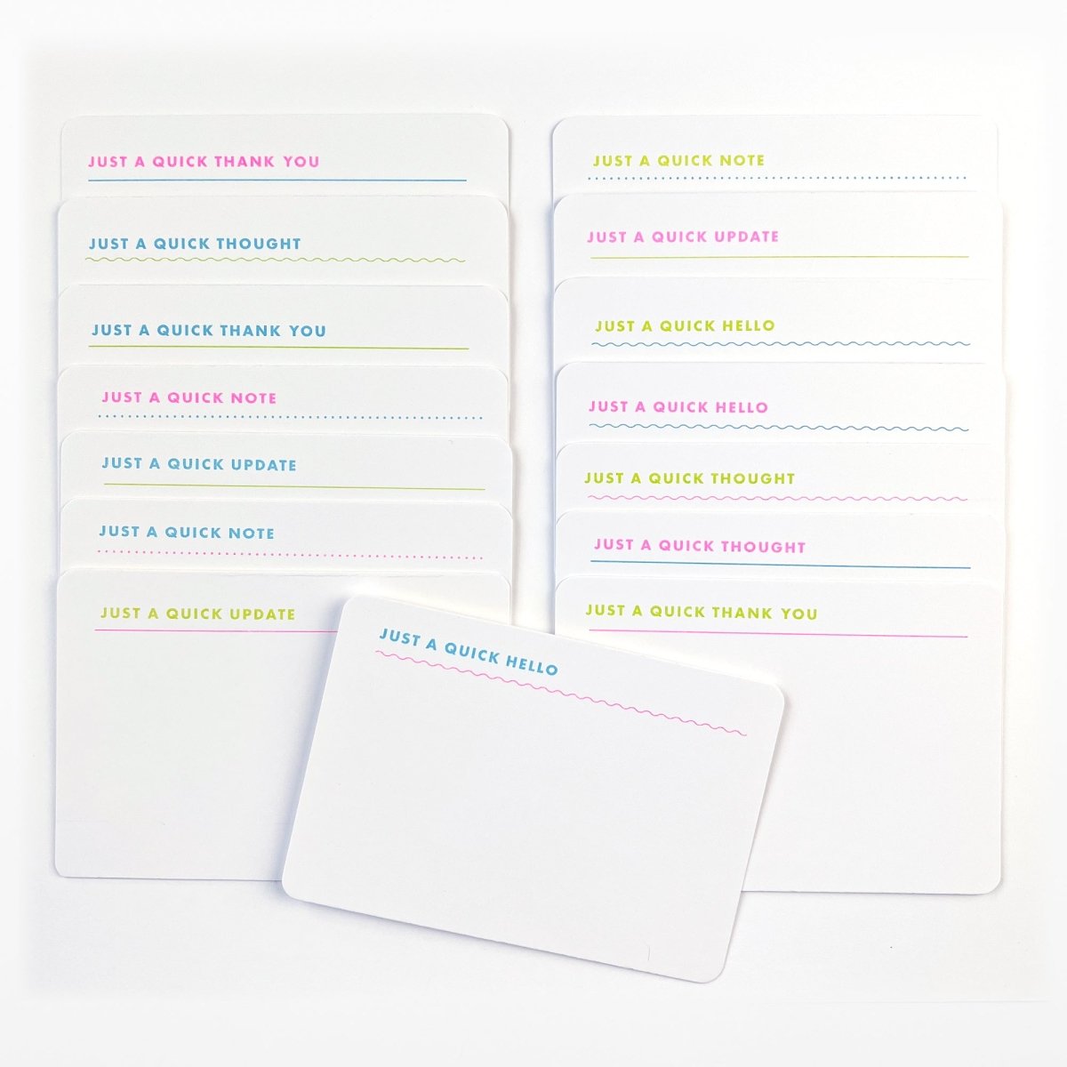 Set of 15 flat notecards - each set includes 5 phrases in 3 color variations. Just a quick... “thank you” “note” “thought” “update” “hello”.