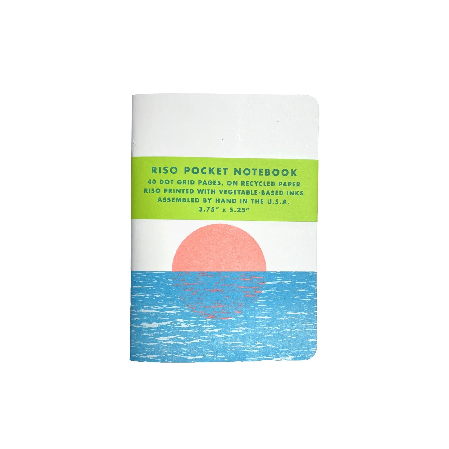 A perfectly compact pocket notebook! As always, cover and inside paper printed with our bright and colorful Riso colors. The cover is seal with soft touch laminate, and stitched together in our classic lime green!