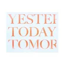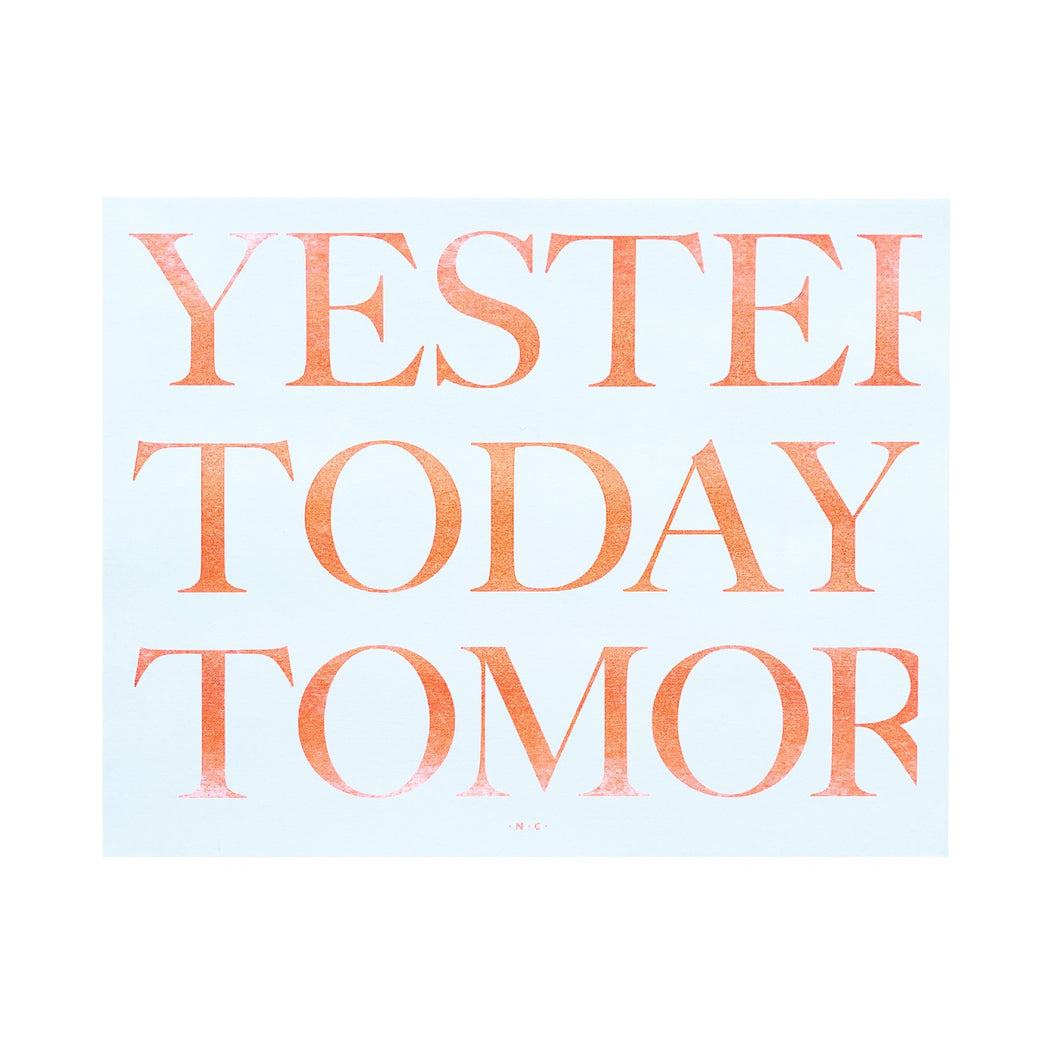The quote: "Yesterday, Today, Tomorrow", printed on fluorescent orange Risograph.